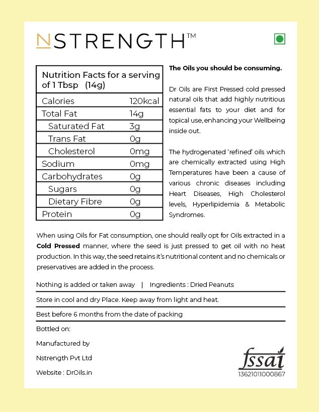 Dr. Oils Cold-Pressed Peanut Oil is a flavor-packed cooking essential, extracted from premium-grade peanuts using a gentle, low-heat process. Its smooth, nutty taste and rich, golden hue make it perfect for stir-fries, dressings, and grilling. High in heart-healthy fats and antioxidants, this oil supports balanced nutrition while elevating every dish’s warmth and depth of flavor.